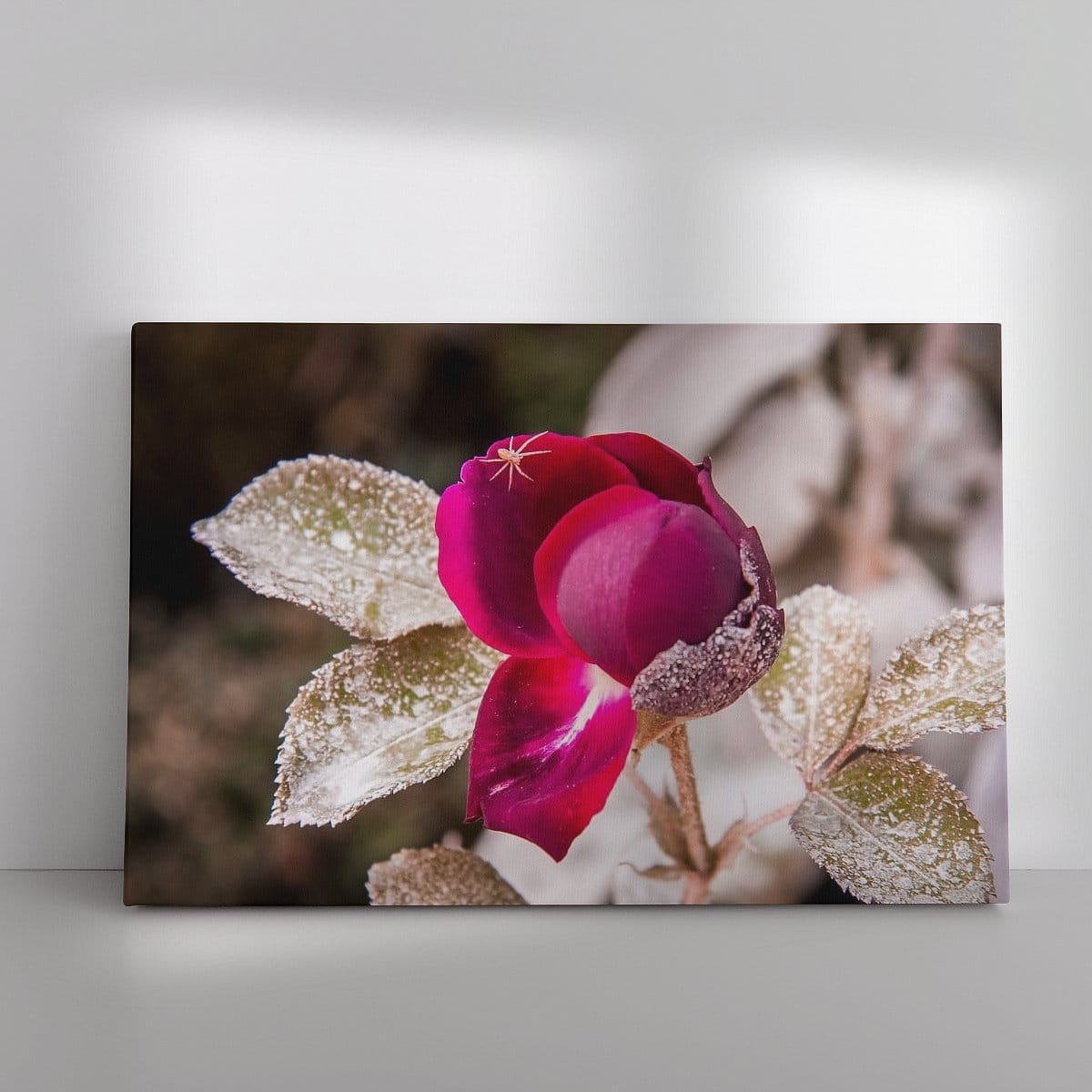 Een dieprode roos trotseert de kou. De bladeren zijn bedekt met rijp, wat een prachtig contrast vormt met de warme kleur van de bloem. Een klein spinnetje zit bovenop het rozenblad en maakt dit winterse natuurtafereel extra bijzonder. Een unieke macro-opname die rust en detail samenbrengt. Perfect voor liefhebbers van natuur, bloemen en verrassende details.